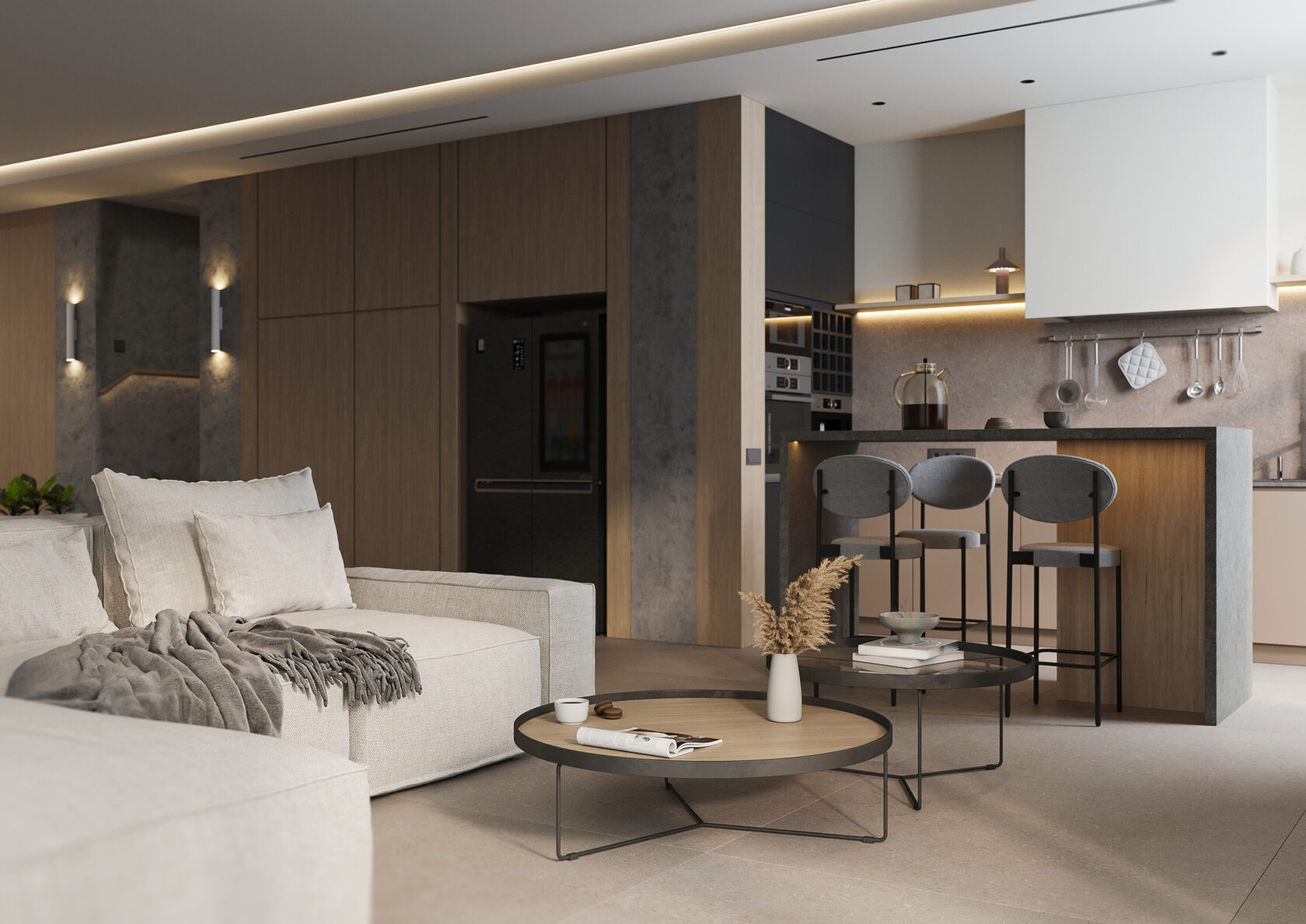 Основная задача данного объекта - сделать пространство максимально функциональным и вместительным с использованием многочисленных мест хранения. Поставленных задач удалось достичь симбиозом стилей: контемпорари, скандинавский и минимализм, а также разделением пространства за счет использования различных отделочных материалов стен, раздвижных дверей, что позволило сохранить пространство единым и перетекающим из одного в другое.
