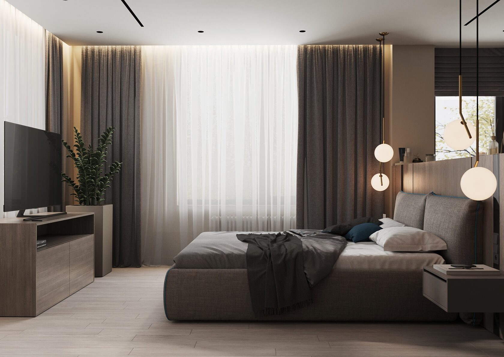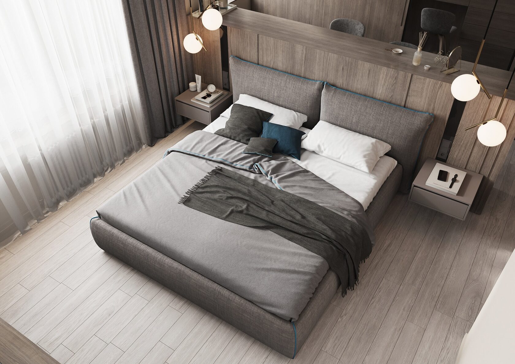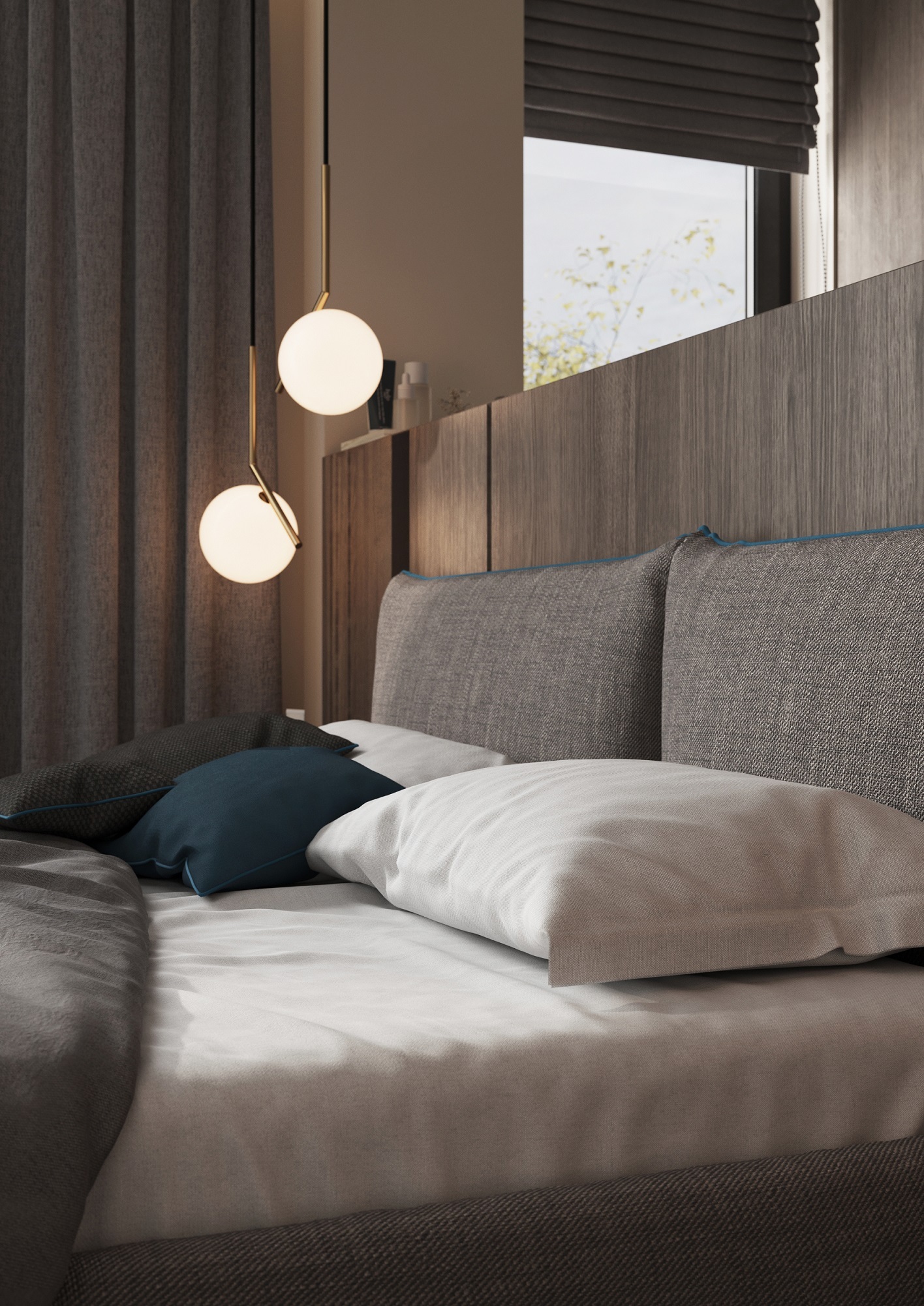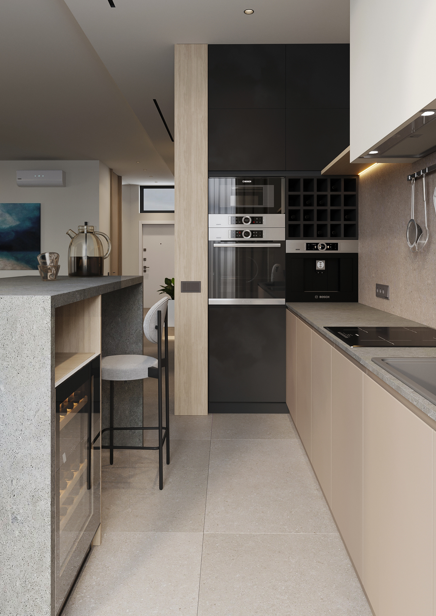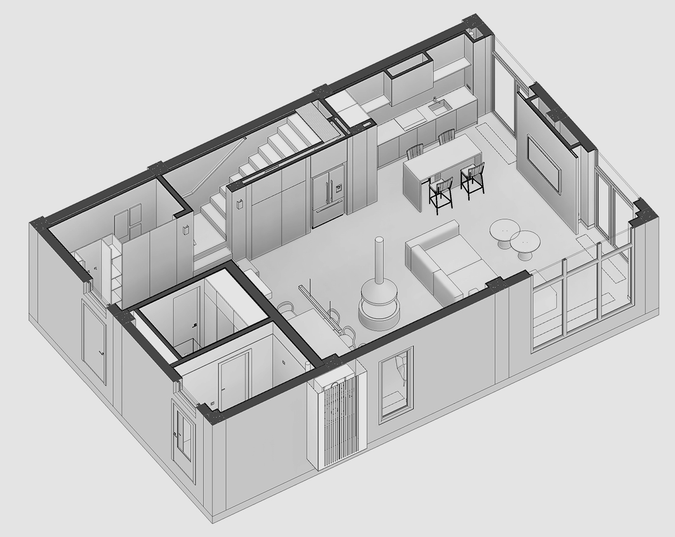 Двухэтажная квартира с мансардой. На первом этаже расположено огромное пространство кухни гостиной со столовой зоной и зоной отдыха с дровяным камином, небольшая гардеробная комната, кладовка, гостевой санузел, котельная. На втором этаже запроектированы: мастер-спальня с ванной комнатой, отдельная ванная комната, 2 детские спальни. Мансардный этаж: зона отдыха совмещенная со спальным местом, большая гардеробная и техническое помещение.