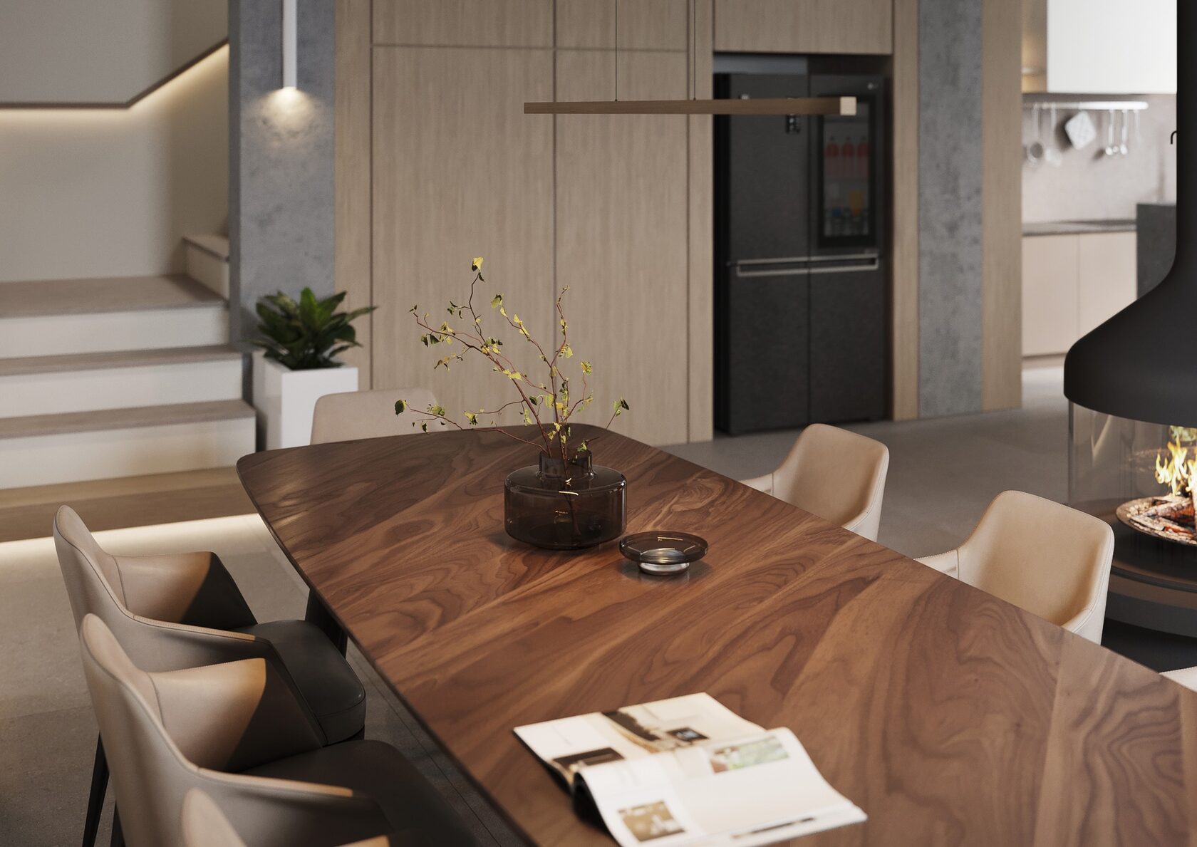 В основу дизайна легли пожелания собственника иметь легкое не перегруженное пространство. Сделать его уютным и в тоже время функциональным удалось за счет первого этажа. Скандинавский стиль отлично сочетается с камином в центре гостиной и является зоной притяжение всех членов семьи. Материалы использованные в качестве отделки оправдали желаемый результат.