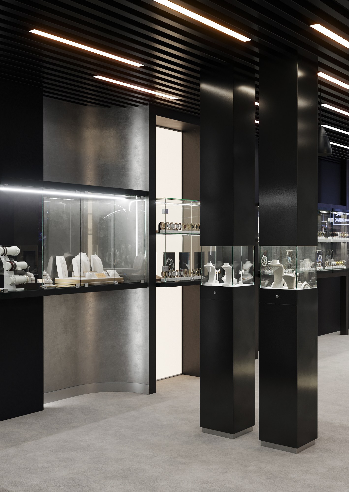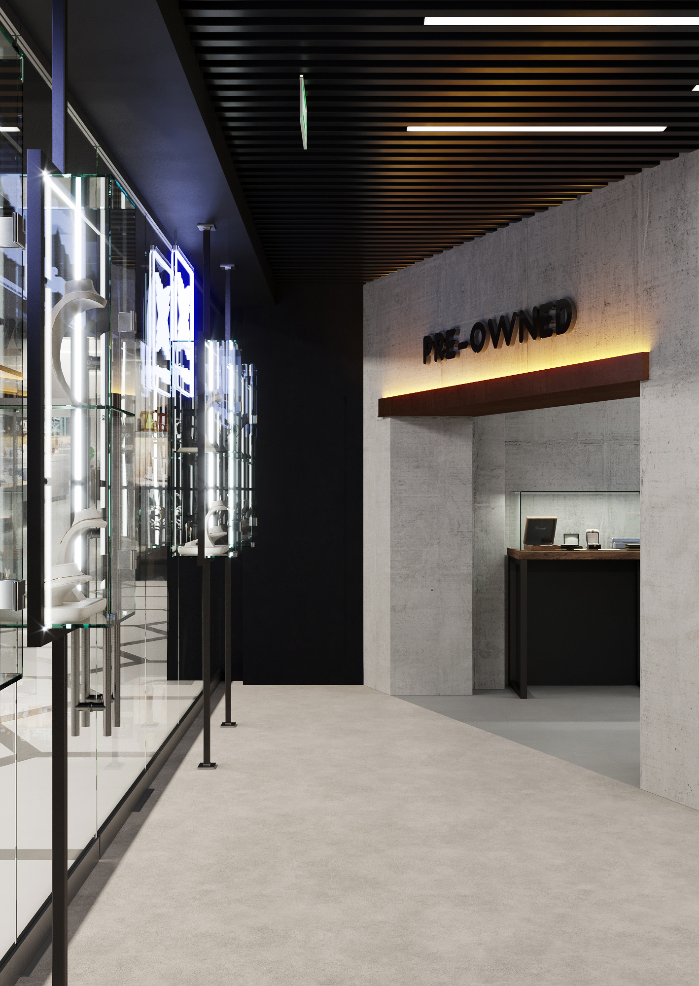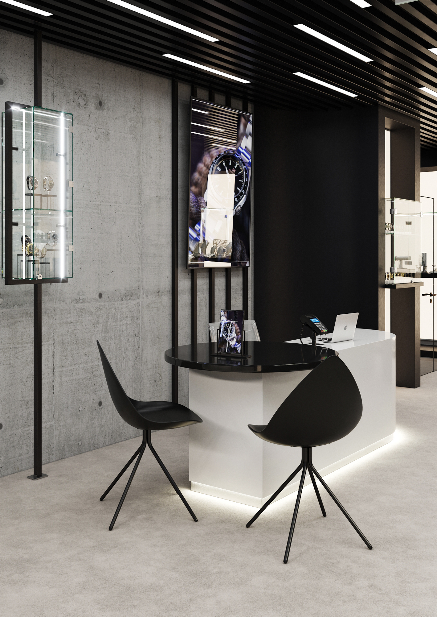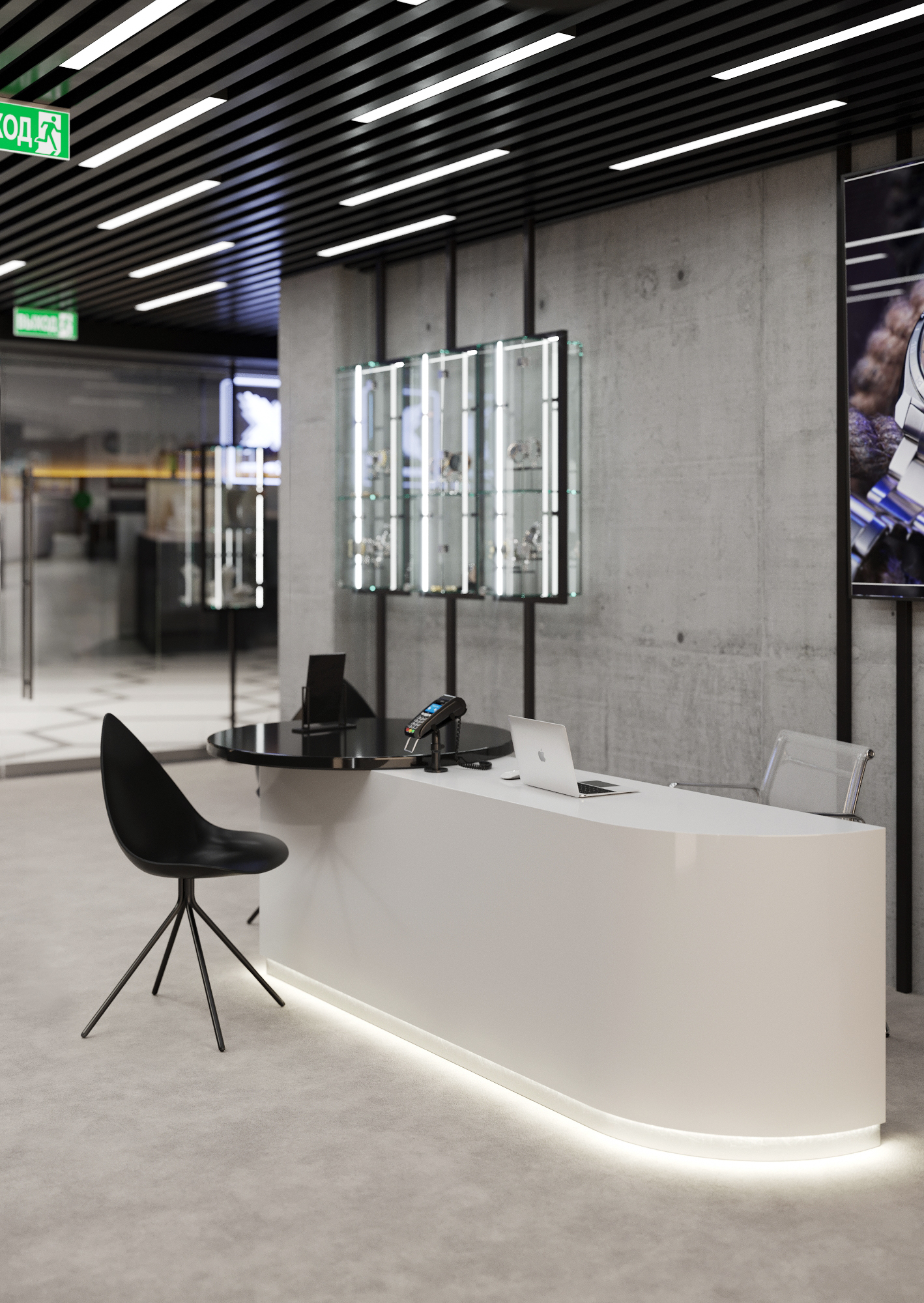 Главная задача при формировании концепции дизайна была разделить одно торговое помещение на три зоны (pre-owned , основная и премиум). Нам удалось сделать это путем концепции loft-underground и хайтек-минимализм. Контраст, созданный путем нескольких материалов, помог достичь желаемого эффекта.